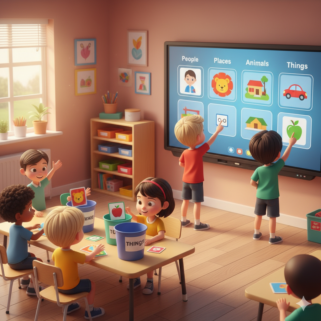- Action: Have them shout out what they see: “I see a tree (Thing)!” or “I see a teacher (Person)!”