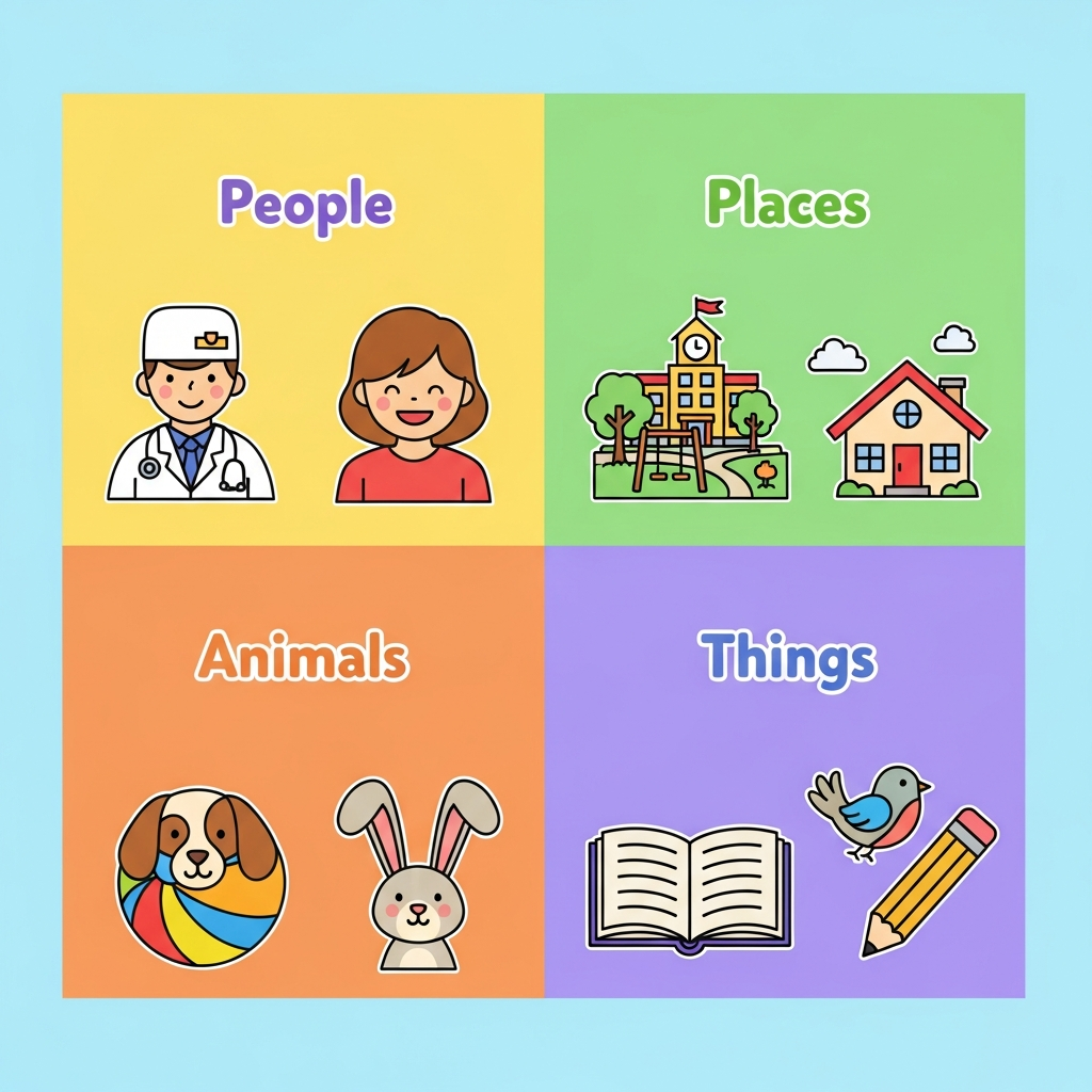 To keep it simple, group every noun into one of these four categories. Using a “Noun Wall” with pictures helps kids see exactly what you mean.