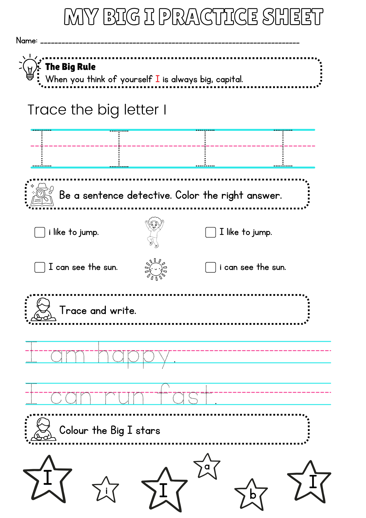 - The “Big I” Rule: Fun writing and colouring tasks teach kids to use a capital “I” when talking about themselves.