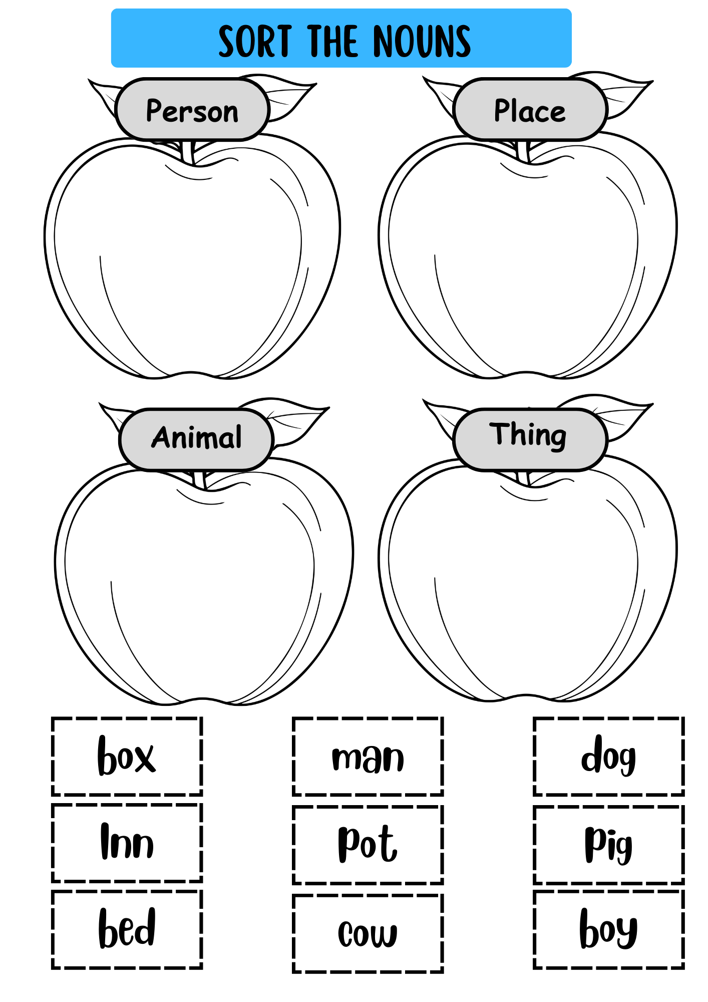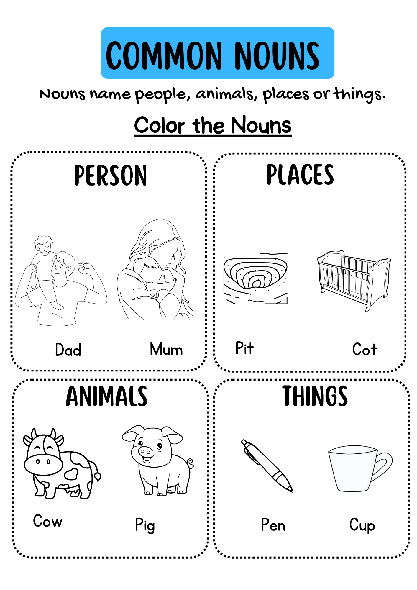 Common nouns are the everyday names for people, places, animals, and things. Kids see common nouns, but can they identify them in a sentence? Our Nouns Worksheet makes this easy through fun colouring and writing activities, helping little learners master the basics of grammar, one naming word at a time.